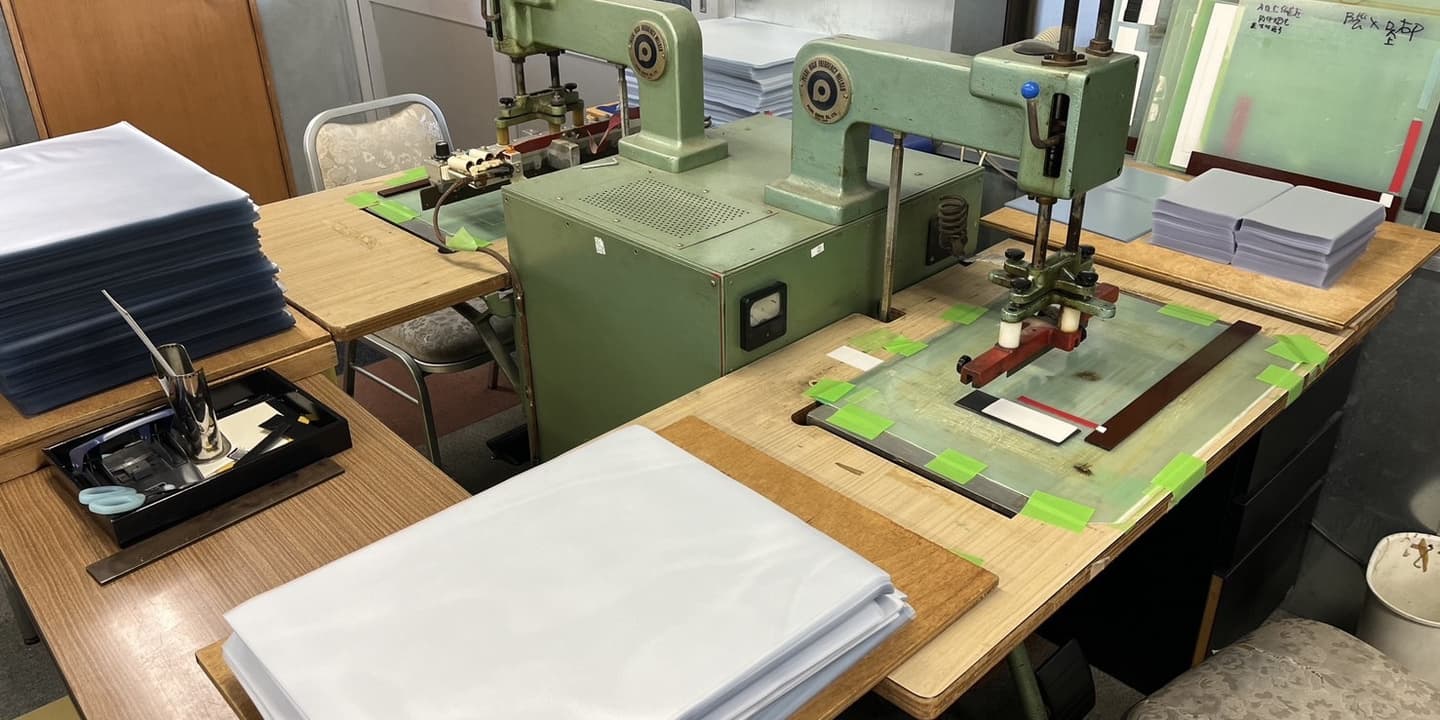 主に高周波ウェルダー機で塩化ビニールの製品作りをしており、車検証カバー、ブックカバー、手帳等製作しております。